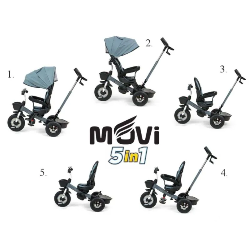 Ir aizsargājošu barjeru, trīs punktu drošības jostām un kāju balstiem.Piepūšamie riteņi ļauj klusi un ērti braukt.Noņemot stumšanas rokturi, barjeru, jumtiņu un sēdekļa pārvalku, MOVI kalpos kā trīsriteņu velosipēds.Bērns var brīvi mīt pedāļus, bet vecāki var regulēt kustības ātrumu.