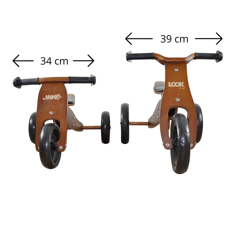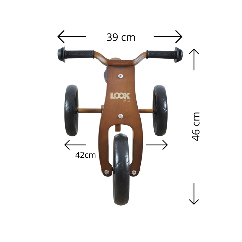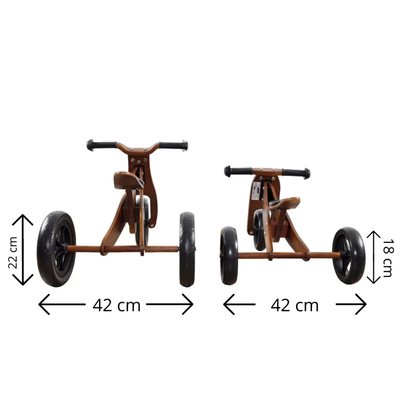 Ritenis izgatavots no izturīga koka.Stūres apstāšanās.Neslīdoši rokturi.9" putuplasta riteņi.4 sēdekļa augstuma regulēšanas līmeņi.Vienkārši gultņi.Divu funkciju (trīsritenis vai divritenis).Maksimālā slodze 25 kg.Piemērots vecums: 18-36 mēn.Atbilst Eiropas drošības standartiem.