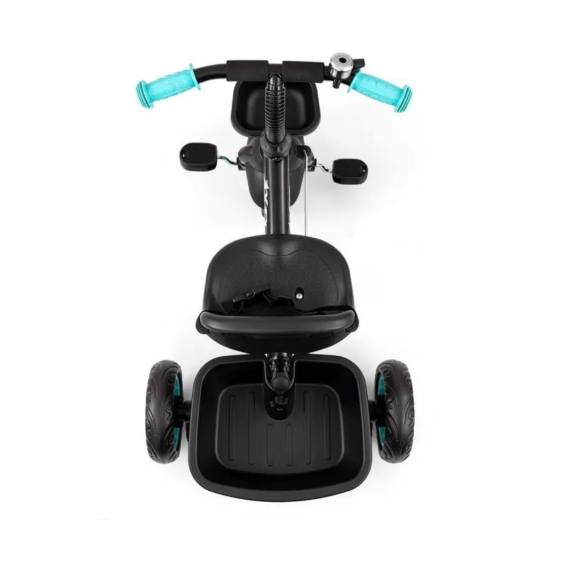 Tērauda rāmis.Priekšējo riteņu pedāļi.Saliekams kāju balsts.Brīvrumbas funkcija.Drošības jostas.Spārns virs priekšējā riteņa.Vecāku roktura garuma regulēšana ar iespēju to pilnībā noņemt.Attāluma starp sēdekli un stūri regulēšana.Zvans.Neslīdoši rokturi.2 x grozi rotaļlietām.Piemērots vecums 1-5 gadi.