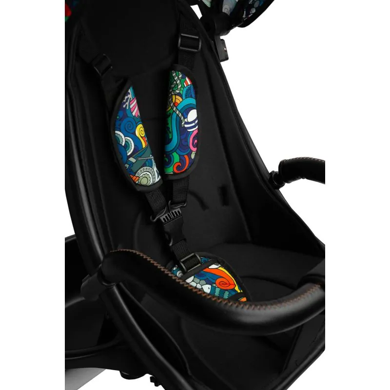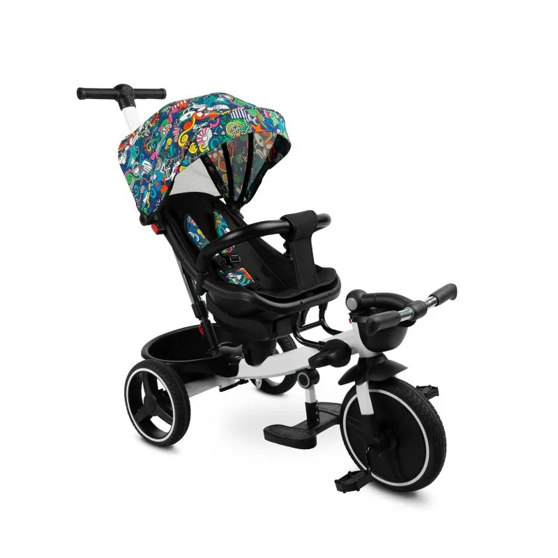 Var izmantot kā trīsriteni, ar kuru bērns var braukt viens, un kā ratiņus ar jumtiņu, kuros bērnu var vest gan uz priekšu, gan atpakaļ.Trīsriteņa priekšpusē un aizmugurē ir groziņi, kuros var nest sīkus priekšmetus.Ir 2 kāju balsti: izvirzīti no velosipēda rāmja un piestiprināti pie sēdekļa.Katrs kāju balsts ir regulējams bērna ērtībai.Aizmugurējiem velosipēda riteņiem ir bremzes.Jumtiņš, kas aizsargā no lietus un saulesNoņemams buferisTrīs punktu drošības jostasPagriežams sēdeklis ar regulējamu atzveltniVieglāk tīrāms poliestera pārvalksDivas neatkarīgas bremzesRegulējama augstuma vadības rokturis2 mazi groziņi