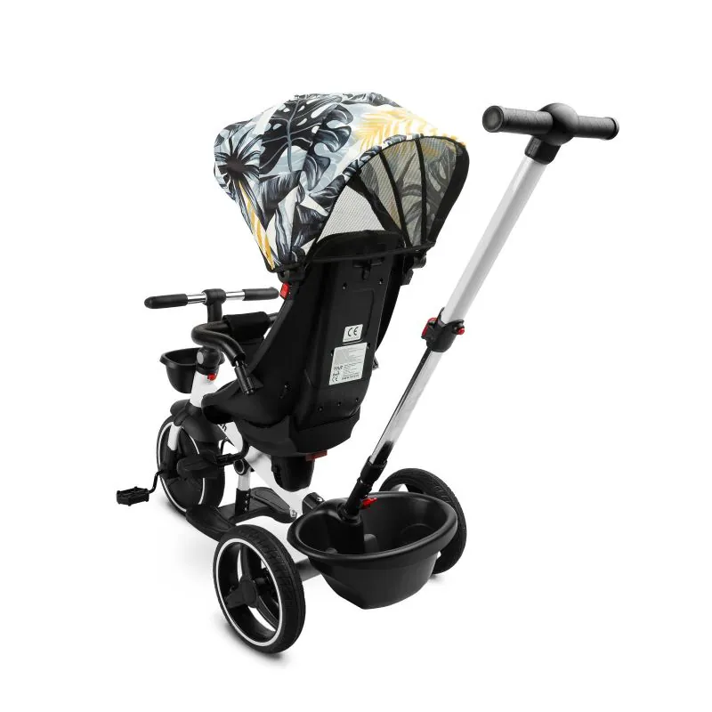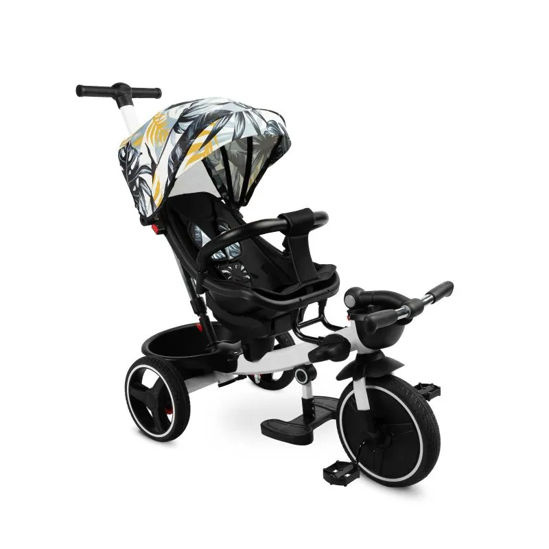 Var izmantot kā trīsriteni, ar kuru bērns var braukt viens, un kā ratiņus ar jumtiņu, kuros bērnu var vest gan uz priekšu, gan atpakaļ.Trīsriteņa priekšpusē un aizmugurē ir groziņi, kuros var nest sīkus priekšmetus.Ir 2 kāju balsti: izvirzīti no velosipēda rāmja un piestiprināti pie sēdekļa.Katrs kāju balsts ir regulējams bērna ērtībai.Aizmugurējie velosipēda riteņi ir aprīkoti ar bremzēm.Jumtiņš, kas aizsargā no lietus un saulesNoņemams buferisTrīspunktu drošības jostasPagriežams sēdeklis ar regulējamu atzveltniViegli tīrāms poliestera pārvalksDivas neatkarīgas bremzesRegulējama augstuma vadības rokturis2 mazi groziņi