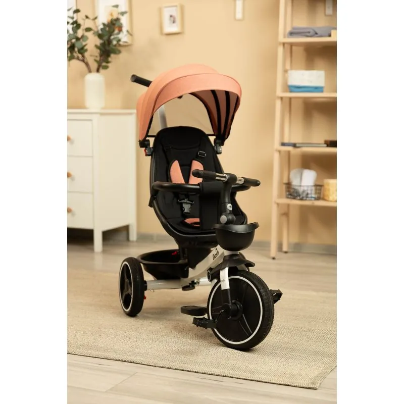 Var izmantot kā trīsriteni, ar kuru bērns var braukt pats, un kā ratiņus ar jumtiņu, kuros bērnu var vest gan uz priekšu, gan atpakaļ. Trīsriteņa priekšpusē un aizmugurē ir groziņi, kuros var nest sīkus priekšmetus. Ir 2 kāju balsti: izvirzīti no velosipēda rāmja un piestiprināti pie sēdekļa. Katrs kāju balsts ir regulējams bērna ērtībai. Aizmugurējie velosipēda riteņi ir aprīkoti ar bremzēm.Jumtiņš, kas aizsargā no lietus un saulesNoņemams buomelisTrīs punktu drošības jostasPagriežams sēdeklis ar regulējamu atzveltniViegli tīrāms poliestera pārvalksDivas neatkarīgas bremzesRegulējama augstuma vadības rokturis2 mazi groziņi