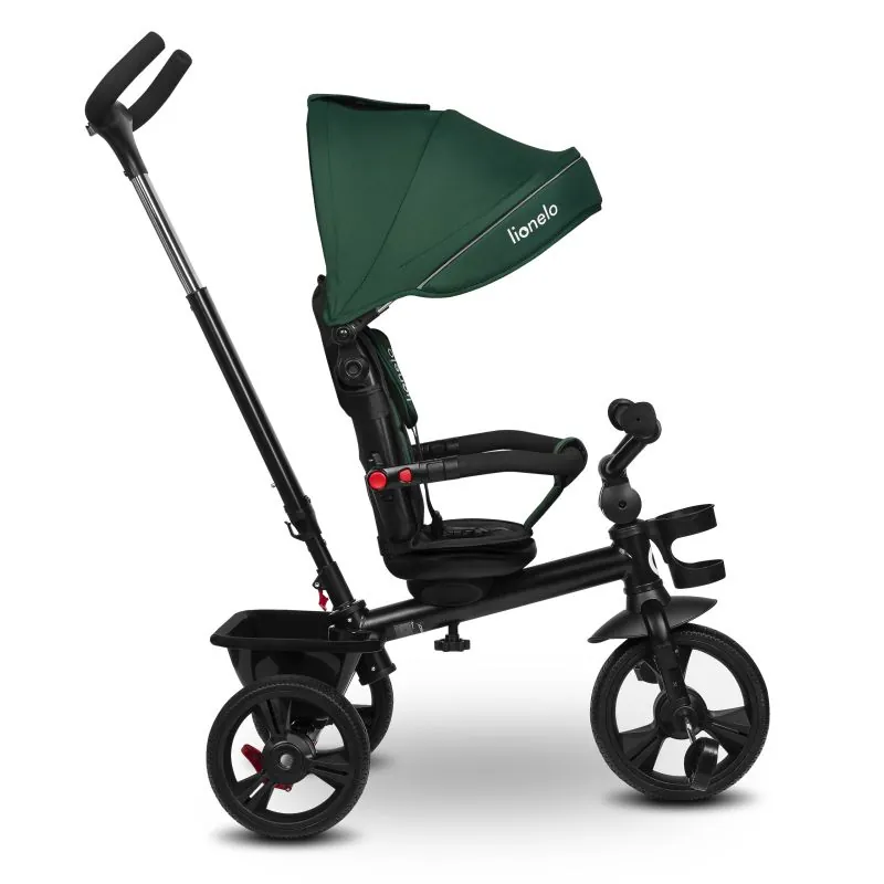 Komplektā ietilpst grozs rotaļlietām un praktisks krūzes vai pudeles turētājs.