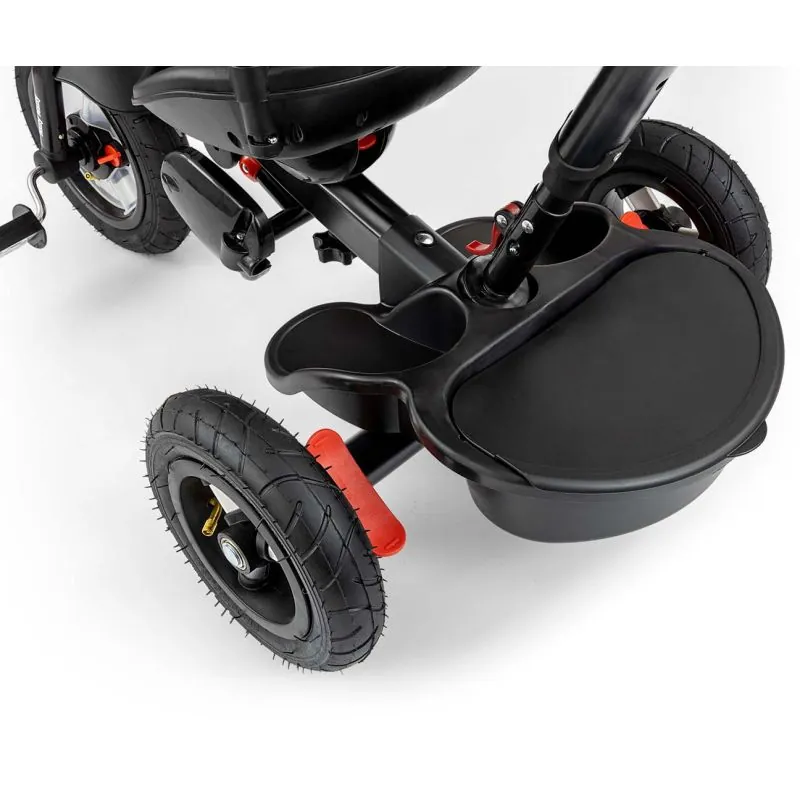 Rotējošs sēdeklis tiek aktivizēts, nospiežot pogu – braukšana uz priekšu vai atpakaļ;Vadība ar regulējamu teleskopisko rokturi;Priekšējā riteņa brīvgaitas ieslēgšanas/izslēgšanas sistēma;"Brīvas vadības" funkcija regulējama ar rokturi;Piecu punktu drošības jostas ar plecu polsteriem;Mīksti un elpojoši sēdekļa audumi ar konturētu bērna galvas aizsardzību;Ērts, 2 līmeņu regulējams atzveltne līdz pusguļus pozīcijai kā ratiņos;Noņemams sēdekļa pārvalks;Saliekams pārsegs + noņemams no UV stariem aizsargājošs jumtiņš ar logu;Piepūšami riteņi ar gultņiem;Augstas kvalitātes tērauda rāmis;Priekšējam ritenim ir vāks, kas aizsargā kājas no iestrēgšanas;Aizmugurējais grozs sīkumiem;Neslīdoši pedāļi;Papildu kāju platforma mazākiem bērniem;Gumijas neslīdoši rokturi;Aizmugurējo riteņu bremze;Stūres ierobežotājs;Regulējamas drošības jostas;Grozs uz stūres;Krūzes turētājs uz stumšanas roktura;Zvans;Vecums: no 1 gada vecuma;Atbilst stingriem Eiropas drošības standartu prasībām.