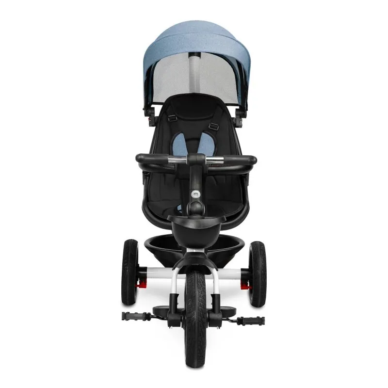 Var izmantot kā trīsriteni, ar kuru bērns var braukt viens, un kā ratiņus ar jumtiņu, kuros bērnu var vest gan uz priekšu, gan atpakaļ.Trīsriteņa priekšā un aizmugurē ir groziņi, kuros var nest sīkus priekšmetus.Ir 2 kāju balsti: izvirzīti no velosipēda rāmja un piestiprināti pie sēdekļa.Katrs kāju balsts ir regulējams bērna ērtībai.Velosipēda aizmugurējiem riteņiem ir bremzes.Jumtiņš, kas aizsargā no lietus un saulesNoņemams buomelisTrīs punktu drošības jostasPagriežams sēdeklis ar regulējamu atzveltniVieglāk tīrāms poliestera pārvalksDivas neatkarīgas bremzesRegulējama augstuma vadības rokturis2 mazi groziņi