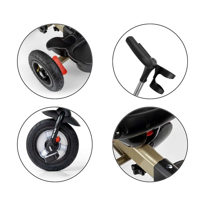 Rotējošais sēdeklis tiek aktivizēts, nospiežot pogu – braukšana uz priekšu vai atpakaļ;Vadība ar regulējamu teleskopisko rokturi;Priekšējā riteņa brīvgaitas ieslēgšanas/izslēgšanas sistēma;"Brīvās vadības" funkcija regulējama ar rokturi;Piecu punktu drošības jostas ar plecu spilventiņiem;Mīksti un elpojoši sēdekļa audumi ar konturētu bērna galvas aizsardzību;Ērts, 2 līmeņu regulējams atzveltne līdz pusguļus pozīcijai kā ratiņos;Noņemams sēdekļa pārvalks;Salokāms pārsegs + noņemams no UV stariem aizsargājošs jumtiņš ar logu;Piepūšami riteņi ar gultņiem;Augstas kvalitātes tērauda rāmis;Priekšējam ritenim ir vāciņš, kas aizsargā kājas no iestrēgšanas;Aizmugurējais grozs sīkumiem;Neslīdoši pedāļi;Papildu kāju platforma mazākiem bērniem;Gumijas neslīdoši rokturi;Aizmugurējo riteņu bremze;Stūres ierobežotājs;Regulējamas drošības jostas;Grozs uz stūres;Krūzes turētājs uz stumšanas roktura;Zvans;Vecums: no 1 gada vecuma;Atbilst stingriem Eiropas drošības standartu prasībām.