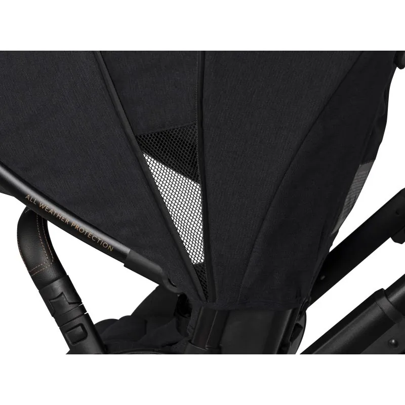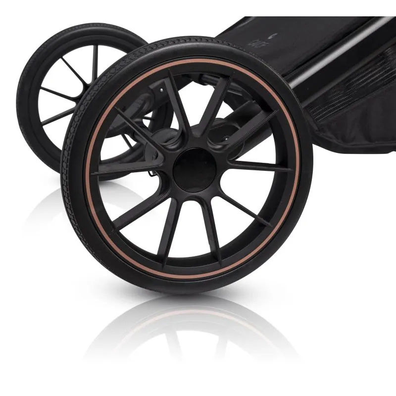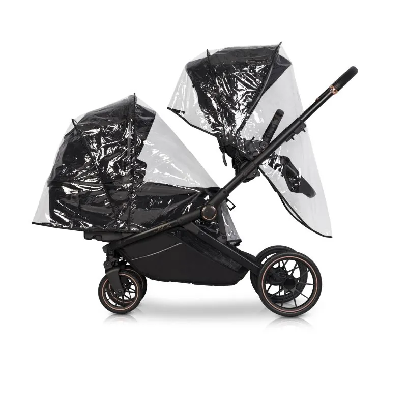 EN 1888: 2012 standarta atbilstības sertifikātsNoņemami sēdekļi (var uzstādīt uz priekšu un atpakaļ)Inovatīva aizmugurējā moduļa augstuma regulēšanas sistēma,Teleskopiska roktura augstuma regulēšana (vadītājs),3 pakāpju atzveltnes regulēšana sēdekļos un regulējams kāju balstsLieli riteņi ar gultņiem un gumijas riepām (lieliska saķere arī uz sniega),Sēdekļi ar 5 punktu drošības jostām, piemēroti bērniem līdz 15 kgBuferi un rokturis pārklāti ar ekoloģisku āduLietus aizsargs, kas pārklāj visu ratiņu apdari (atsevišķi katram sēdeklim)Tīkls pret kukaiņiem (atsevišķi katram sēdeklim)Kāju pārsegs (atsevišķi katram sēdeklim)Jumtiņos ir ventilācijas tīkliPašizlīdzinoši priekšējie riteņi ar iespēju bloķēt, braucot taisni,Liels iepirkumu grozs zem ratiņiem (viegla piekļuve grozam, pateicoties atloka aizmugurē),Atstarojošs elements uz groza (labāka redzamība un drošība)Var atsevišķi iegādāties šūpuli, māmiņas somu un automašīnas sēdekli, kā arī adapterus.