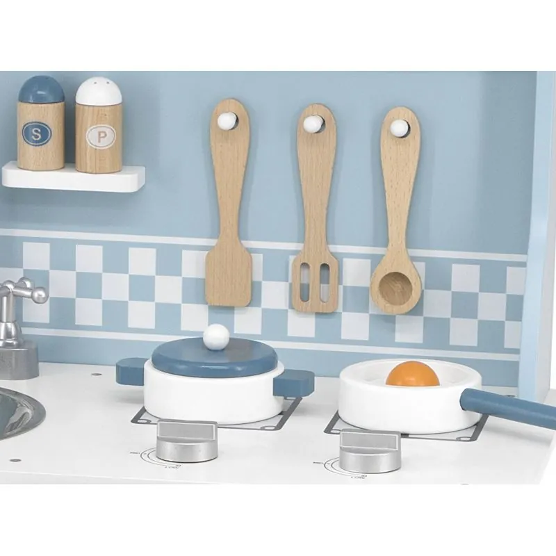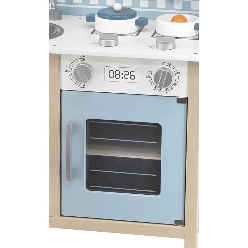 Virtuvē ir izlietne, cepeškrāsns un plīts, kurā bērns varēs radīt iecienītus ēdienus visai ģimenei.Virtuvē ir visi nepieciešamie piederumi: katls ar vāku, panna ar ceptu olu, karote, caurumota lāpstiņa, trauciņi ar sāli un pipariem.Virtuves pulkstenis ļauj bērnam kontrolēt laiku, gatavojot ēdienu.4 grozāmi rokturi.Pēc ēdiena gatavošanas bērns var mazgāt traukus izlietnē un atkal gatavot.Spēlējot bērns iemācās būt atbildīgs par savu nekārtību un tīrīšanu.