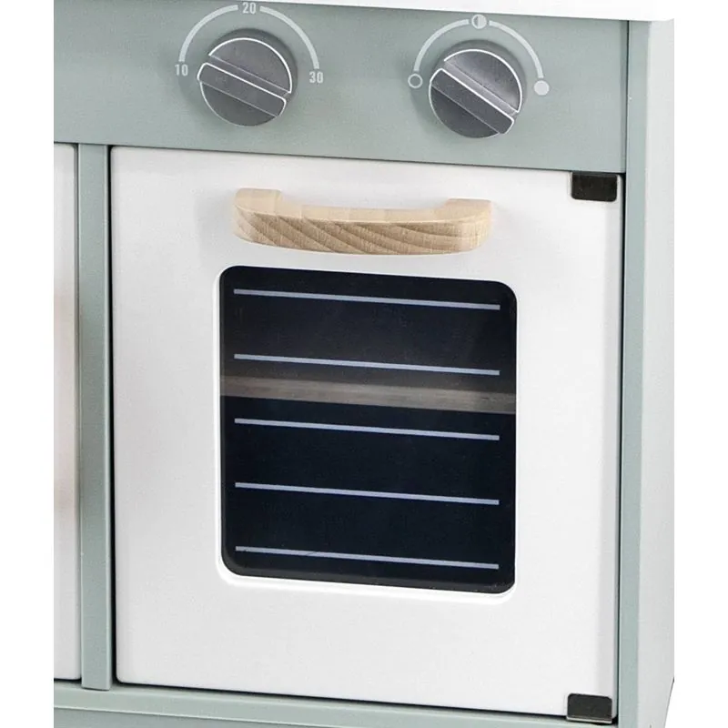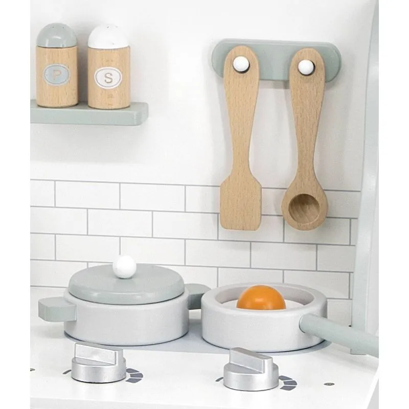Virtuvē ir izlietne, cepeškrāsns un plīts, kurā bērns varēs radīt iecienītus ēdienus visai ģimenei.Virtuvē ir visi nepieciešamie piederumi: katls ar vāku, panna ar ceptu olu, karote, caurumota lāpstiņa, trauciņi ar sāli un pipariem.Virtuves pulkstenis ļauj bērnam kontrolēt laiku, gatavojot ēdienu.4 pagriežami rokturi.Pēc ēdiena gatavošanas bērns var mazgāt traukus izlietnē un atkal gatavot.Spēlējot bērns iemācās būt atbildīgs par savu nekārtību un tīrīšanu.