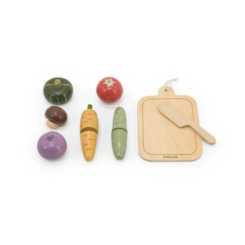 Lieliska rotaļlieta, kas rosina jūsu bērna iztēli;Šīs koka rotaļlietas, kas veidotas kā dažādi dārzeņi, var izmantot arī kā vizuālus līdzekļus grupu aktivitātēs un mājās;Kamēr vecāki gatavo maltīti visai ģimenei, mūsu mazais pavārs vai pavāre sagatavos dārzeņu salātus ar iecienītākajām piedevām savām lellēm un lācīšiem;Pateicoties drošajam koka nazim, bērni var viegli "sagriezt" sēni, gurķi vai tomātu;Spēlējot kopā, vecāki var iemācīt saviem bērniem, kā nākotnē izmantot asus virtuves rīkus;Papildu priekšrocība ir tā, ka visi izstrādājumi ir savienoti ar "Velcro" uzlīmēm, nodrošinot nebeidzamu izklaidi;Visi tie izskatās izsmalcināti un reālistiski. Sagriežot tos, var atkal savienot;Dārzeņu griešanas dēļu komplekts patiks pirmsskolas vecuma zēniem un meitenēm;Koka dārzeņi var dažādot lomu spēles, papildināt spēļu virtuves un palīdzēt bērniem iemācīties gatavot vienkāršus ēdienus;Bērni kļūst komunikabli, radošāki un pārliecinātāki par sevi;Šis komplekts attīsta sociālās prasmes, attīsta smalko motoriku, domāšanu un iztēli;