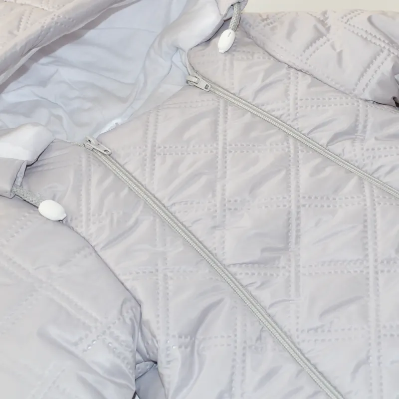 Neizpūšams kombinezons zīdainim ar kapuci;Priekšpusē atverams ar diviem rāvējslēdzējiem;Ārējais materiāls neizpūšams;Iekšpuse izgatavota no OEKOTEX sertificētas un mīkstas 100% kokvilnas;Krāsa: Pelēka;Kombinezons piemērots ziemai un aukstiem pavasara/rudens vakariem;Ražots Polijā;