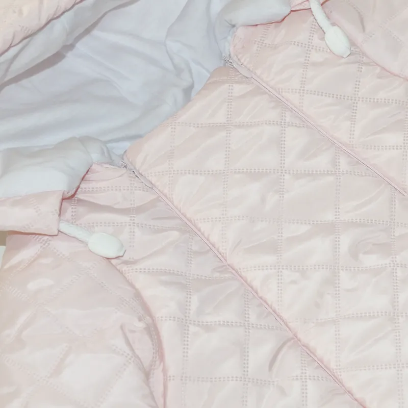 Neizpūšams kombinezons zīdainim ar kapuci;Priekšpusē atverams ar diviem rāvējslēdzējiem;Ārējais materiāls neizpūšams;Iekšpuse izgatavota no OEKOTEX sertificētas un mīkstas 100% kokvilnas;Krāsa: Rozā;Kombinezons piemērots ziemai un aukstiem pavasara/rudens vakariem;Ražots Polijā;